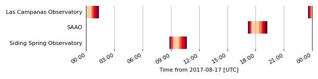 $ ligo-skymap-plot-observability --site 'Las Campanas Observatory' 'SAAO' 'Siding Spring Observatory' --time 2017-08-17 bayestar.fits.gz -o bayestar.png